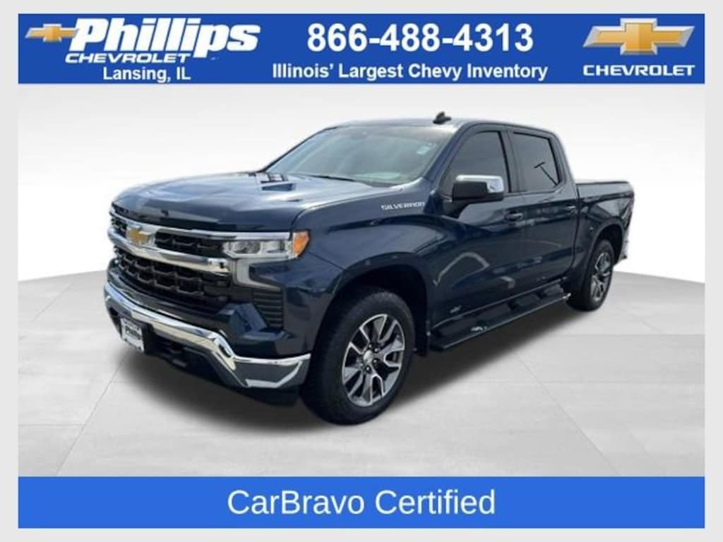 CarBravo Certified, No Added Cert. Fees, Certified Multi-Point Inspection, 4WD!, Heated Seats, Heated Steering Wheel, Apple CarPlay, Forward Collision Alert, Backup Camera, BLUETOOTH, Power Windows/Locks, Power Seating, PUSH BUTTON START!, Turbo!, 20 Wheels!, Remote Start, Cruise Control, Carfax Buyback Guarantee, Silverado 1500 LT, 4D Crew Cab, 2.7L Turbo, 8-Speed Automatic, 4WD, Northsky Blue Metallic, Black Cloth, 10-Way Power Driver Seat w/Lumbar, 12.3 Multicolor Reconfigurable Digital Display, 3.42 Rear Axle Ratio, 4-Wheel Disc Brakes, 40/20/40 Front Split-Bench Seat, 6-Speaker Audio System, ABS brakes, All-Star Edition, AM/FM radio: SiriusXM with 360L, Apple CarPlay/Android Auto, Auto-Locking Rear Differential, Automatic Emergency Braking, Bluetooth® For Phone, Brake assist, Bumpers: chrome, Chrome Mirror Caps, Cloth Seat Trim, Compass, Convenience Package, Deep-Tinted Glass, Driver door bin, Driver vanity mirror, Dual front impact airbags, Dual front side impact airbags, Electrical Steering Column Lock, Electronic Cruise Control, Electronic Stability Control, Following Distance Indicator, Forward Collision Alert, Front anti-roll bar, Front Center Armrest w/Storage, Front dual zone A/C, Front Frame-Mounted Black Recovery Hooks, Front Pedestrian Braking, Front reading lights, Front wheel independent suspension, Fully automatic headlights, HD Rear Vision Camera, Heated door mirrors, Heated Driver & Front Outboard Passenger Seats, Heated Steering Wheel, High Capacity Suspension Package, Hitch Guidance, Illuminated entry, IntelliBeam Automatic High Beam On/Off, Keyless Open & Start, Lane Keep Assist w/Lane Departure Warning, Leather Wrapped Steering Wheel, LED Cargo Area Lighting, Low tire pressure warning, Manual Tilt/Telescoping Steering Column, Not Equipped w/Steering Column Lock, Occupant sensing airbag, OnStar & Chevrolet Connected Services Capable, Outside temperature display, Overhead airbag, Overhead console, Panic alarm, Passenger door bin, Passenger vanity mirror, Power door mirrors, Power Front Windows w/Driver Express Up/Down, Power Front Windows w/Passenger Express Down, Power Rear Windows w/Express Down, Preferred Equipment Group 2FL, Rear 60/40 Folding Bench Seat (Folds Up), Rear reading lights, Rear step bumper, Rear window defroster, Security system, SiriusXM w/360L, Speed control, Speed-sensing steering, Split folding rear seat, Standard Suspension Package, Steering Wheel Audio Controls, Tachometer, Telescoping steering wheel, Theft Deterrent System (Unauthorized Entry), Tilt steering wheel, Traction control, Trailering Package, Trip computer, Variably intermittent wipers, Voltmeter, Wheels: 20 x 9 Painted Aluminum, Wi-Fi Hot Spot Capable, Wireless Phone Projection. 2022 Chevrolet Silverado 1500 Northsky Blue Metallic LT 4D Crew Cab 4WD 8-Speed Automatic 17/20 City/Highway MPG 2.7L TurboRecent Arrival!Certification Program Details: Type your description hereWith the internet today, a great value shouldnât be hard to find. Here at Phillips Chevrolet we do the research for you. We monitor the market daily to ensure our customers are getting the best value achievable. We price all of our vehicles to make the buying process as simple and easy as possible. Our internet prices are just one factor that makes us the #1, #2, and out to be the #3 Chevrolet dealerships in Illinois. The #2 Chevy dealership in Illinois is conveniently located just a one block south of 80/94, at 17730 S Torrence Avenue in Lansing, IL 60438.