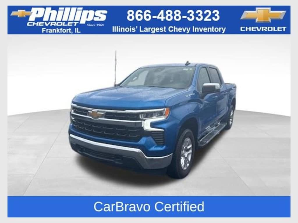 CarBravo Certified, 4WD, Trailering Package, Backup Camera, Remote Start, Pwr Dr Seat, Heated Seats, Heated Steering Wheel, Apple CarPlay, Aluminum Wheels, Carfax Buyback Guarantee, Silverado 1500 LT LT1, 4D Crew Cab, 2.7L Turbo, 8-Speed Automatic, 4WD, Glacier Blue Metallic, Jet Black w/Cloth Seat Trim, 10-Way Power Driver Seat w/Lumbar, 12.3 Multicolor Reconfigurable Digital Display, 120-Volt Instrument Panel Power Outlet, 3.42 Rear Axle Ratio, 4-Wheel Disc Brakes, 40/20/40 Front Split-Bench Seat, 6-Speaker Audio System, ABS brakes, All-Star Edition, AM/FM radio: SiriusXM with 360L, Apple CarPlay/Android Auto, Auto High-beam Headlights, Auto-Locking Rear Differential, Automatic Emergency Braking, Automatic temperature control, Bluetooth® For Phone, Brake assist, Bumpers: chrome, Chrome Mirror Caps, Cloth Seat Trim, Color-Keyed Carpeting Floor Covering, Compass, Convenience Package, Deep-Tinted Glass, Driver door bin, Driver vanity mirror, Dual front impact airbags, Dual front side impact airbags, Dual Rear USB Ports (Charge Only), Dual-Zone Automatic Climate Control, Electric Rear-Window Defogger, Electrical Steering Column Lock, Electronic Cruise Control, Electronic Stability Control, EZ Lift Power Lock & Release Tailgate, Following Distance Indicator, Forward Collision Alert, Front anti-roll bar, Front Center Armrest w/Storage, Front Frame-Mounted Black Recovery Hooks, Front Pedestrian Braking, Front reading lights, Front Rubberized Vinyl Floor Mats, Front wheel independent suspension, Fully automatic headlights, HD Rear Vision Camera, Heated Driver & Front Outboard Passenger Seats, Heated Power-Adjustable Outside Mirrors, Heated Steering Wheel, Hitch Guidance, Illuminated entry, Inside Rear-View Mirror w/Tilt, IntelliBeam Automatic High Beam On/Off, Keyless Open & Start, Lane Keep Assist w/Lane Departure Warning, LED Cargo Area Lighting, Low tire pressure warning, Not Equipped w/Steering Column Lock, Occupant sensing airbag, OnStar & Chevrolet Connected Services Capable, Outside temperature display, Overhead airbag, Overhead console, Passenger door bin, Passenger vanity mirror, Power door mirrors, Power Front Windows w/Driver Express Up/Down, Power Front Windows w/Passenger Express Down, Power Rear Windows w/Express Down, Preferred Equipment Group 1LT, Radio: Chevrolet Infotainment 3 Premium System, Rear 60/40 Folding Bench Seat (Folds Up), Rear reading lights, Rear Rubberized-Vinyl Floor Mats, Rear step bumper, Remote Vehicle Starter System, Security system, SiriusXM w/360L, Speed-sensing steering, Standard Suspension Package, Standard Tailgate, Steering Wheel Audio Controls, Steering wheel mounted audio controls, Tachometer, Telescoping steering wheel, Theft Deterrent System (Unauthorized Entry), Tilt steering wheel, Traction control, Trailering Package, Trip computer, Variably intermittent wipers, Voltmeter, Wheels: 18 x 8.5 Bright Silver Painted Aluminum, Wi-Fi Hot Spot Capable, Wireless Phone Projection, Wrapped Steering Wheel. 2023 Chevrolet Silverado 1500 Glacier Blue Metallic LT 4D Crew Cab LT1 4WD 8-Speed Automatic 18/21 City/Highway MPG 2.7L Turbo